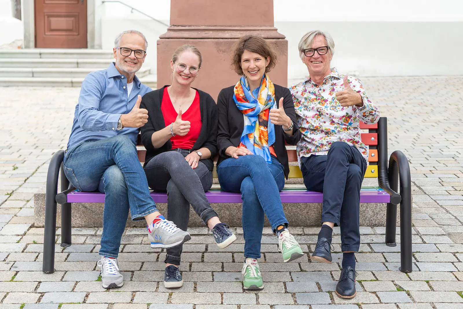 Vier Mitglieder des Stiftungsrats der Bürgerstiftung Bad Waldsee (von links nach rechts: Christoph Mayer, Annalena Denninger-Maucher, Regina Steinhauser, Dr. Thomas Sapper) auf der neuen Regenbogenbank vor der katholischen Kirche in Bad Waldsee anlässlich der Aktion vom 12.7.2025.